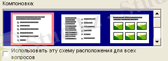 г) Компоновка . Сұрақтардың экранда орналасуының схемасы. Сұрақ және жауаптардың орналасу схемасын таңдау үшін Использовать эту схему расположения для всех вопросов