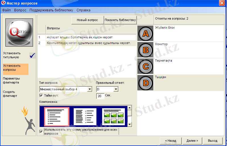- №2 сүретте көрсетілгенМастер вопросовтерезесі ашылады. Мастер вопросов қосымшасын пайдаланып түрлі үлгідегі тестілерді дайындауымызға болады. Сонымен қатар жауап нұсқасыИя/Жоқ, Дұрыс/Қатеүлгісінде болатын сауалнамаларды да құрастыруымызға болады. Жауаптар саны неше нұсқадан тұратынын - екі нұсқа, үш нұсқа,, , алты нұсқадан тұратынын да өзіміз тағайындаймыз.