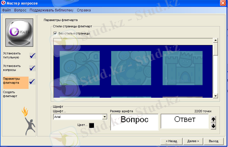Ескерту. Қазақ әліпбиіне тән, латиницада кездеспейтін Ә, Ң, Ғ, Ү, Ұ, Қ, Ө, Һ әріптері сұрақтарды құрастырғанда жазыла береді, тек тестілеу флипчарты қосылғанда олардың орнына ? белгішесі пайда болады. Сондықтан Далее батырмасын басудан алдын шрифт типін таңдап алуымыз қажет (үнсіз келісім бойынша мұнда - №4 сүретте көрініп тұрғандай - Arial типі таңдаулы болады) . Өзіміз жиі қолданатын Times New Roman шрифт типін таңдасақ бұл кемшілік жойылатын болады.