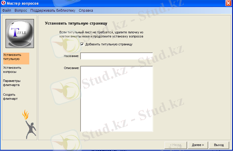 Мастер вопросов қосымшасы бізге тест сұрақтарын дайындау, өңдеу және сақтау сияқты мүмкіндіктер береді. Бұл қосымша бірнеше қадамнан тұрады. Әр қадамда біз өзімізге қажетті параметрлерді енгізіп отыруымыз керек.
