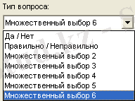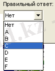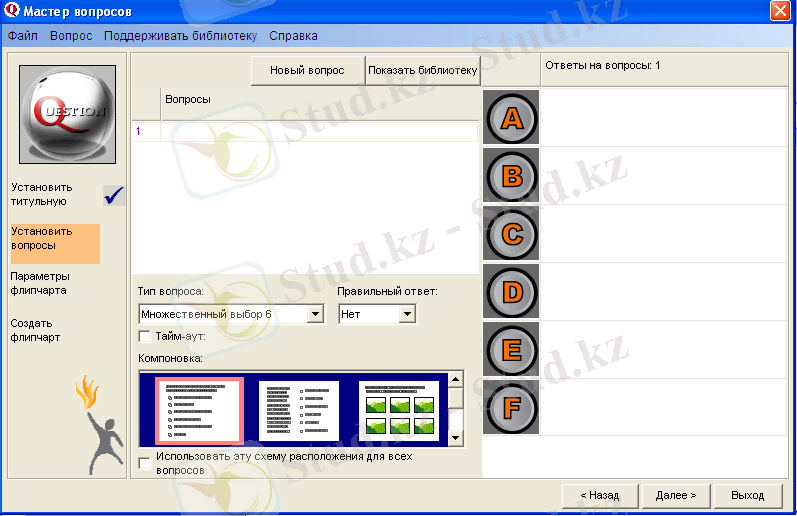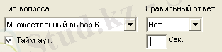 . Сұрақтарға жауап беру 7 түрде болуы мүмкін. Ия/Жоқ, Дұрыс/Қате 2 нұсқадан дұрысын таңдау, 3 нұсқадан дұрысын таңдау, т. с. с. 6 нұсқаға дейін. Егер біз Множественный выбор 4 қатарын таңдасақ терезенің оң жағындағы жауап нұсқалары қатарынан E және F нұсқалары алынып тасталады.