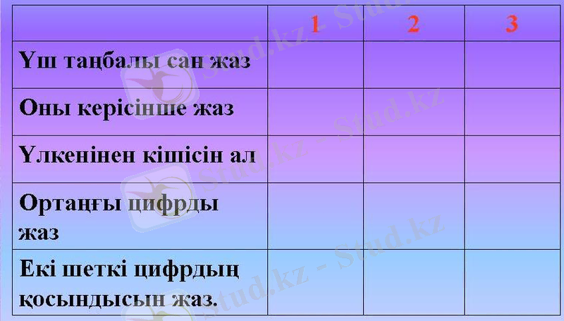 Жауабы: Үш таңбалы сан жаз: 321 214
