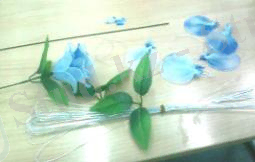 Таңдалған қалыпты алып сыммен 10-12 дана, бір келкі күлтелер дайындаймыз. Күлтелерді капрондармен қаптап, жіппен орап бекітеміз. Дайын күлтелерді сабағымен біріктіріп, желімді таспамен өңдейміз. Дәнегін қосамыз, бекітеміз. Жапырақтарды сабағына кигізіп, бекіту. Гүлді жөндеп қалпына келтіру.