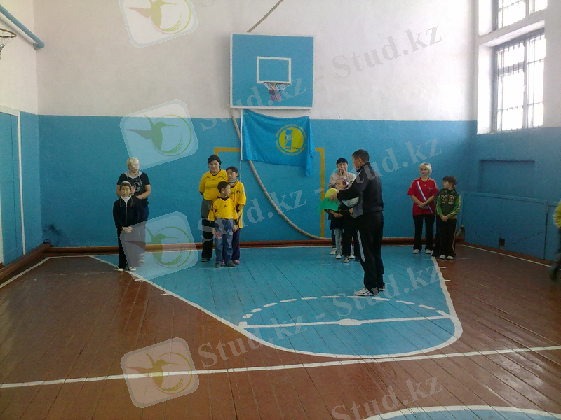 Сайыстың барысы: Спорт залында көңілді музыка ойнап тұрады.