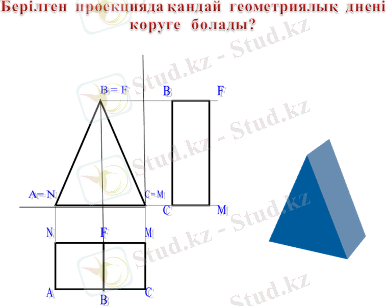 Проекция жазықтығы дегеніміз не, Олар қалай аталады? Берілген проекциядан қандай геометриялық денені байқауымызға болады? Сызбада үш жақты берілген проекция үлгісі. Яғни айтқанда фронталь, горизонталь, профиль