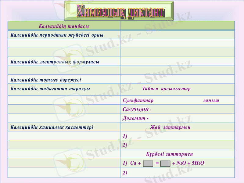 1. Білімділік. Кальций, атом құрылысы, қасиеттері, периодтық жүйедегі орны, ашылу тарихы, табиғатта таралуы,, алынуы, физикалық, химиялық қасиеттері жайында мәлімет беру.