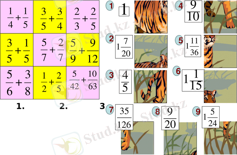 Жай бөлшектерді қосу арқылы қосындыға сәйкес суреттерді қою керек. сонда жолбарыс суреті шығады7