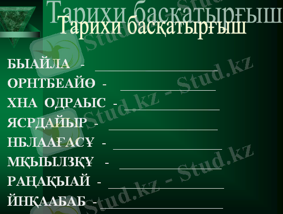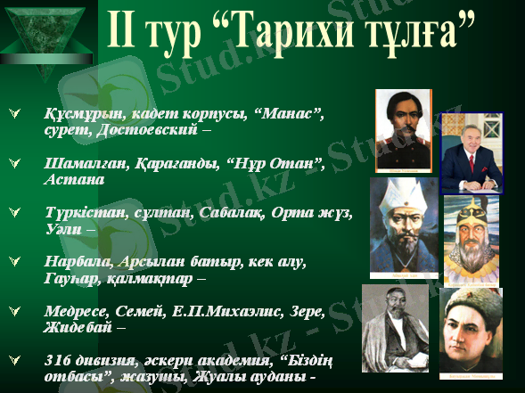 Әр тарихи тұлғаға байланысты сөздер беріледі, оқушы сөздермен танысып кім туралы екенін айтып беру керек. Оқушы жауап берген соң тұлғаның портреті көрсетіледі.