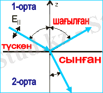 - Түскен сәуле, сынған сәуле және екі ортаны бөлетін бетке сәуле түскен нүктеден тұрғызылған перпендикуляр бір жазықтықта жатады.