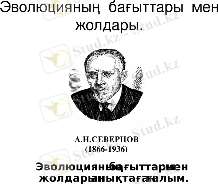 Сабақтың мақсаты: Органикалық дүние эволюциясының бағыттарын қарастыру, А. Н. Северцовтың ұсынған сызбанұсқасын түсіндіру.