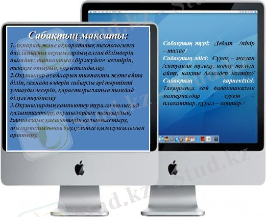 - Оқушылардың компьютер туралы толық ой қалыптастыру, оқушылардың тапқырлық, іздемпаздық қасиеттерін қалыптастыру, шығармашылыққа баулу, пәнге қызығушылығын арттыру.
