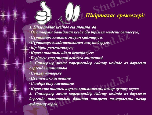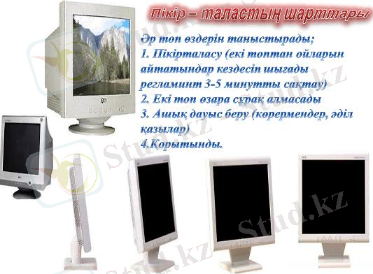 - Пікірталасу (екі топтан ойларын айтатындар кездесіп шығады регламинт 3-5 минутты сақтау)