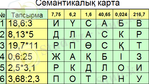 Семантикалық картаның жолдарындағы есепті шығару керек. Есептің шешуін баған аттарынан тауып, қиылысқан тұстағы әріпті белгілеу керек.