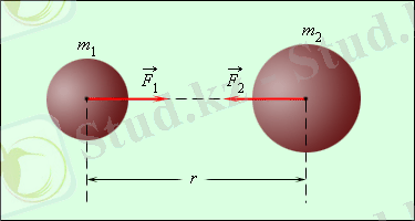 мұндағы, G - гравитациялық тұрақты деп аталатын пропорционалдық коэффициент. Бұл күш бір-біріне әсер ететін денелер арқылы өтетін түзудің бойымен бағытталған. Формула шамасы бойынша бір-біріне тең F 12 және F 21 күштердің сандық мәнін береді. Cуреттегі өзара әсерлесетін денелер біртекті шарлар болса, m 1 және m 2 - шар массалары, r - олардың центрінің ара қашықтығы. Сонымен, шарлар материялық нүктелер ретінде өзара әсерлеседі, ал олардың массалары шар массаларына тең және олардың центрлерінде орналасқан. Гравитациялық тұрақтының сандық мәні, массалары белгілі денелердің бір-біріне тартылатын күшін өлшеу жолымен анықталған. Осындай өлшеу кезінде көп қиыншылықтар кездеседі, өйткені массалары тікелей өлшенетін денелер үшін тартылыс күштері өте-мөте аз болып шығады.