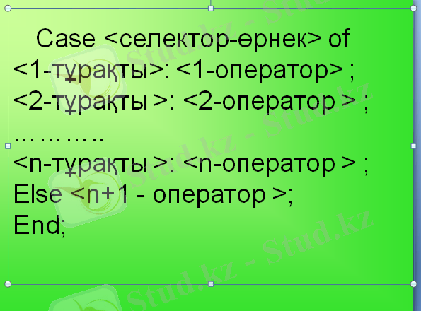 CASE таңдау операторы көп тармақты алгоритмдерді барынша қарапайым және көрнекі түрде жазуға мүмкіндік береді. Оның құрамында селектор (selector - таңдау) деп аталатын өрнек және параметрлер тізімі болуы тиіс, әрбір параметрге сәйкес таңдау тұрақтылары болуы қажет. Таңдау операторының жазылуы пішімі: