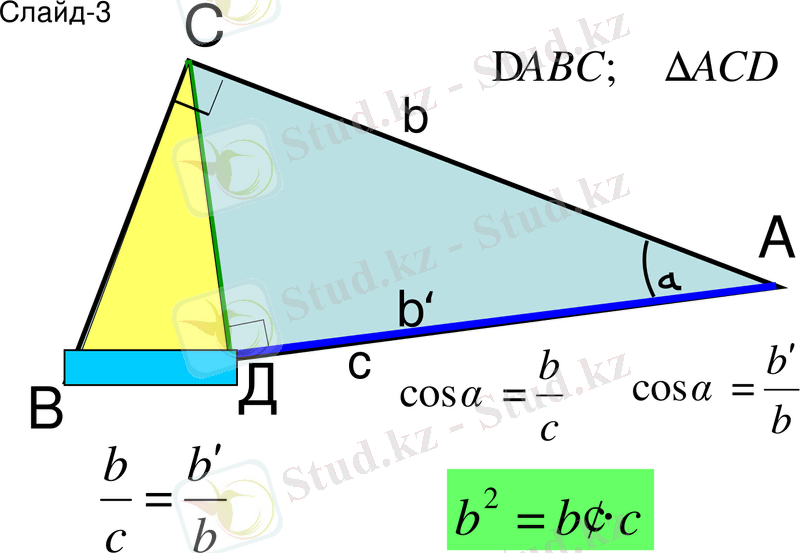- Пропорцияның негізгі қасиетіне сүйеніп, катеттің квадратын гипотенуза мен катеттің гипотенузадағы проекциясы арқылы өрнектейді.