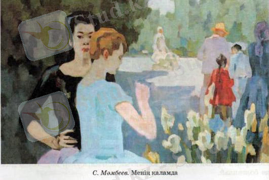 Фон. Бұл - бетіне бір нәрсенің суреті салынған негізгі түс, астар. Суретші фонды шығармадағы кейіпкерлер анық көрінетіндей етіп таңдайды. Сонымен қатар фон картинаның немесе суреттің көңіл күйімен сәйкес келуі керек. Фон бейнеленетін заттың қатынасына қарай ақ, қара, түрлі түсті, кеңістікті, бір түсті және қарама-қарсы түсті болуы мүмкін. Тарихи немесе тұрмыстық тақырыпта бейнеленген картинадағы әрекет күнделікті қала көшелерінде, үй ішінде немесе табиғат аясында көрсетіледі. Демек бұның бәрі - белгілі бір фон. Суретші С. Мәмбеевтің «Менің қаламда» атты шығармасының фонында ағаштар, аспан, күн сәулесі төгілген бақ іші, түрлі түсті гүлдерге толған гүлзарлар, жайбарақат серуен құрған адамдар бейнеленген. Суреттегі басты бейне - екі жас кыз. С. Мәмбеев жазғы бақтағы күн нұры мен әр түрлі ағаштардан түскен көлеңкелер арқылы тамаша жайма-шуақ, көңілді көріністі көрерменге жеткізеді.
