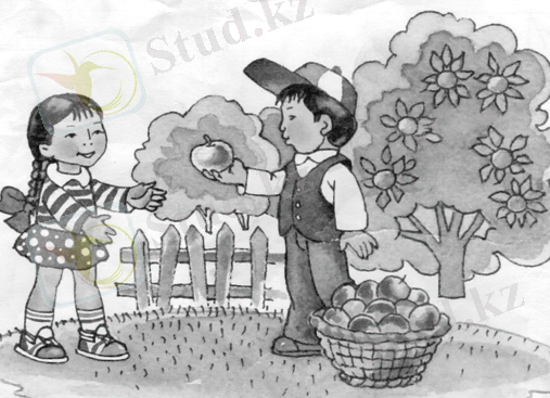 асықтар, қоржын, арба, серіппе, алма ағашы мен алмалардың суреттері, түрлі-