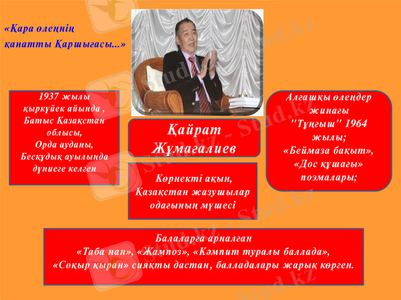 Мұғалім : - Балалар біз бүгін қара өлеңнің қанатты қаршығасы Қайрат Жұмағалиевтің соғыс туралы ойы «Мен соғысты жек көрем» өлеңімен танысамыз.