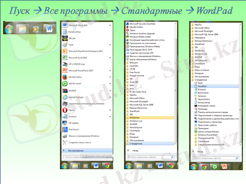 Word Pad - командасы арқылы іске қосылады. Word Pad бағдарлама-сының ашылу жолы интерактивті тақта арқылы көрсетіледі.