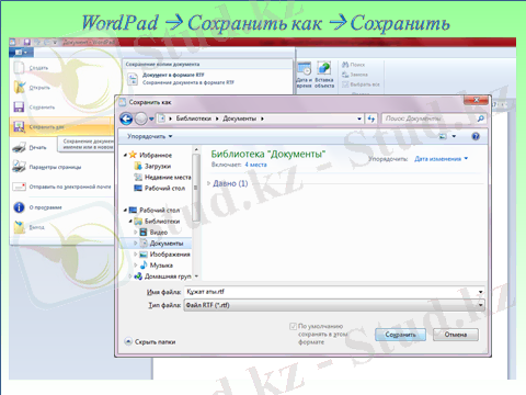 Құрылған құжатты сақтау үшін WordPad 🡪 Сохранить как . . . 🡪 Сохранить - командасы орын-далады. WordPad 🡪 Сохранить как . . . командасынан кейін ашылған диалогтік терезеде құжатты қай жерге және қандай атпен сақтайтынымызды көрсетіп Сохранить батырмасын басу арқылы сақтаймыз.