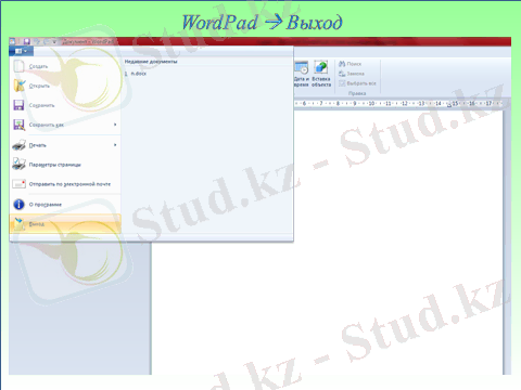 Word Pad мәтіндік редакторында жұмысты аяқтаған соң редактордан шығу жолы: Пуск 🡪 Выход командасы орындалады.