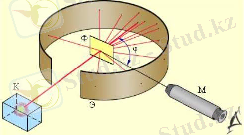 α - бөлшектерін шығарады. α - бөлшектері коллиматордағы тар саңылаудан өтіп, жолына қойылған алтын фольгасына жеткен кезде олардың біразы бағытын өзгертіп, шашырайтындығы белгілі болды. Кейбір бөлшектер тікбұрыштан да үлкен бұрыштарға бұрылатындығы экранда анық көрінеді.
