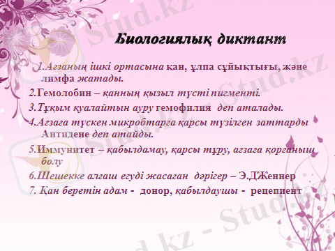 ІV. Биологиялық диктант (Ағзаның ішкі ортасы)