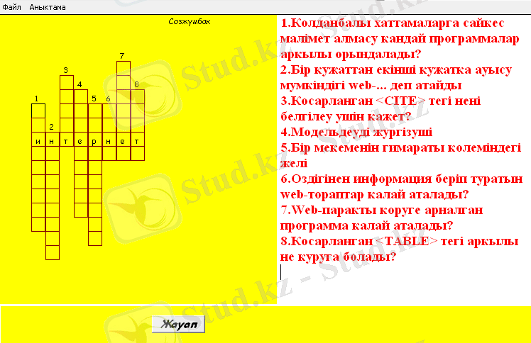 Үшінші тапсырмада Delphi программалау ортасында жасалған сөзжұмбақ ұсынылады (3-сурет)