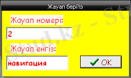 «Жауап» батырмасын шерткенде ашылатын сұхбат терезеде жауап номері мен жауапты енгізіп, сөзжұмбақ сұрағына жауап беруге болады (26-сурет)