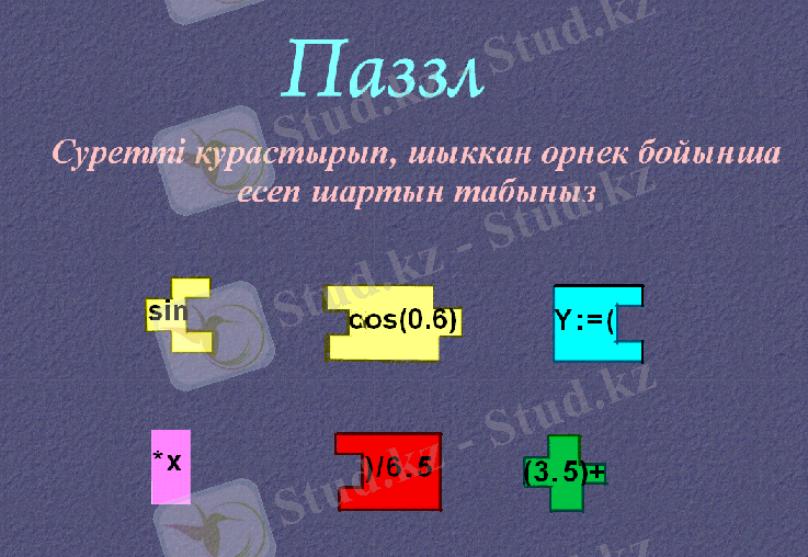 Төртінші тапсырмада паззл тапсырмасы беріледі. Мұнда студенттер паззл бөлшектерін құрастырып, шыққан өрнек бойынша есеп шартын табулары қажет (-сурет) .