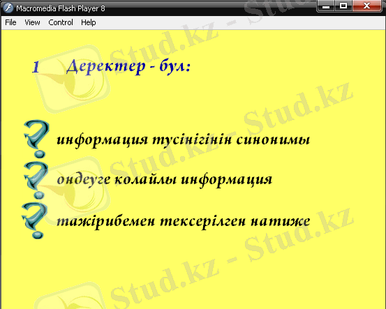 Мәліметтер қорынан бақылау Macromedia Flash MX ортасында жасалған вариантты таңдау тестісі үлгісінде келтірілген (29, 30-суреттер)