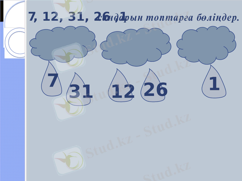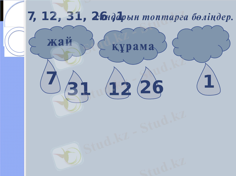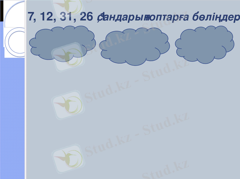 3. 2. Мына натурал сандарды 1, 7, 12, 26, 31 топтарға бөліңдер. (4 слайд)