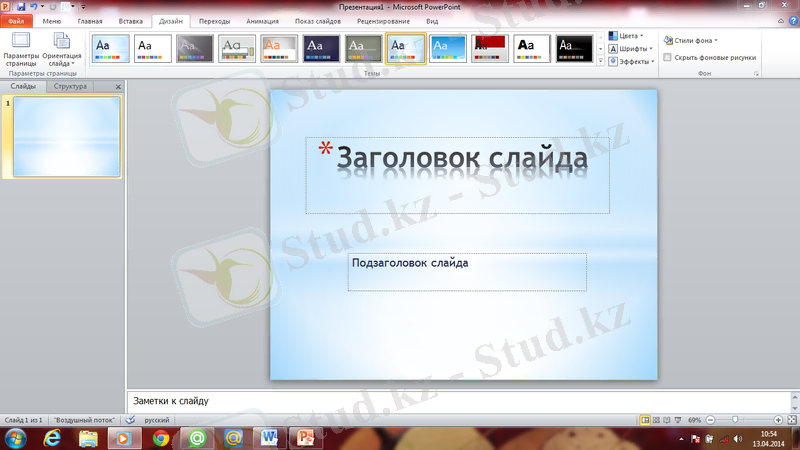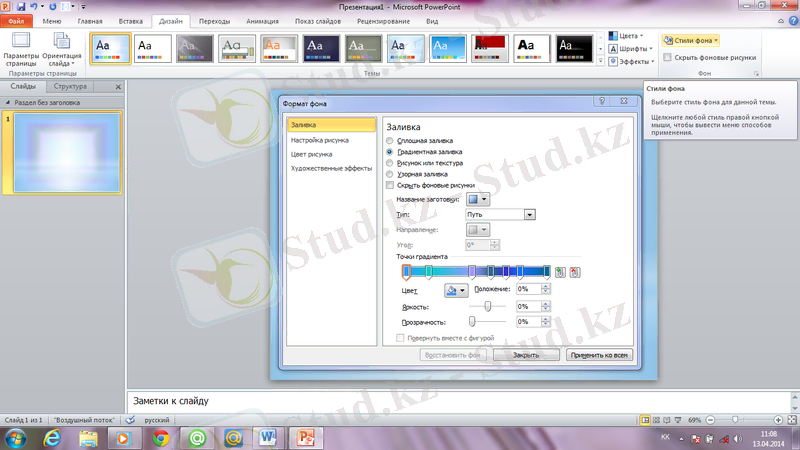 слайдқа беріледі. Фондық түсті барлық слайдтарға беру үшін Барлығын қолдану (Применить ко всем) батырмасын шертеміз.
