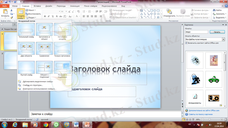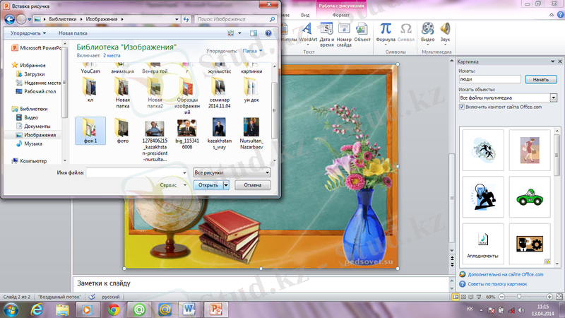 Батырмасын басу немесе Кірістіру мәзірінің Сурет - Суреттер (жинағы) әмірлерін орындау. Тапсырмалар аймағында суреттер жинағы пайда болып, таңдағаныңызды слайдқа бір шертіп кірістіруге болады.