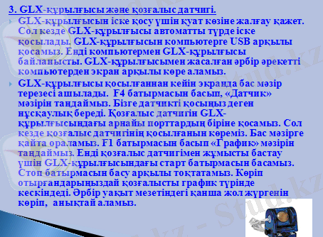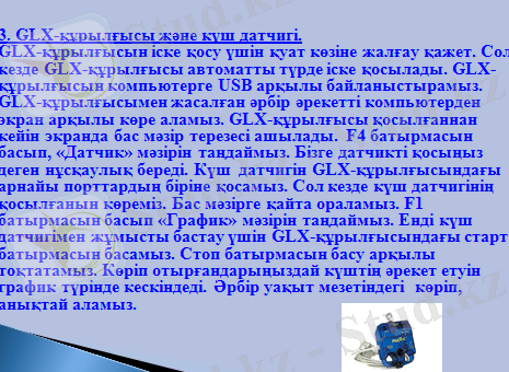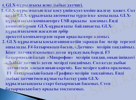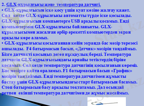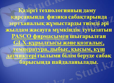 Қазіргі технологияның даму қарсаңында физика сабақтарында зертханалық жұмыстарды тиімді әрі жылдам жасауға мүмкіндік туғызатын PASCO фирмасымен шығарылған GLX-құрылғысы және қозғалыс, температура, дыбыс, қысым, күш датчиктері ғылыми білім беруде сабақ барысында пайдаланылады. Бүгінгі сабақта GLX-құрылғысы туралы және оның жұмыс істеу принцпі және де датчиктерді қосып олардың мүмкіндіктерін айқындайтын боламыз. Сонымен