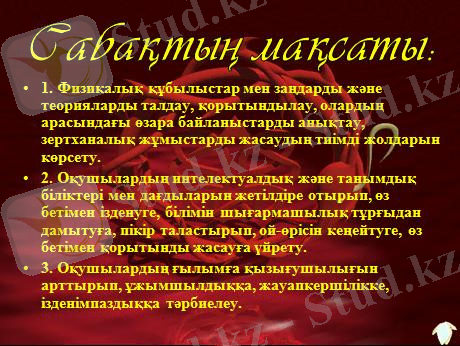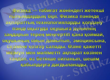 Физика пәнінде ақпараттық технологияларды қолдану пәнді оқытуда оқушыға дүниенің заңдарын терең меңгертіп қоймай, оқушының ойын дамытып, эмоциясына, сезіміне қозғау салады. Өзіне қажетті мазмұн мен мәліметті ақпарат көзінен таңдап, өз бетінше ойланып, шешім қабылдауға дағдыланады.
