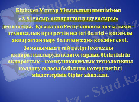 Біріккен Ұлттар Ұйымының шешімімен «ХХІ ғасыр-ақпараттандыру ғасыры» деп аталды . Қазақстан Республикасы да ғылыми - техникалық прогрестің негізгі белгісі - қоғамды ақпараттандыру болатын жаңа кезеңіне енді.