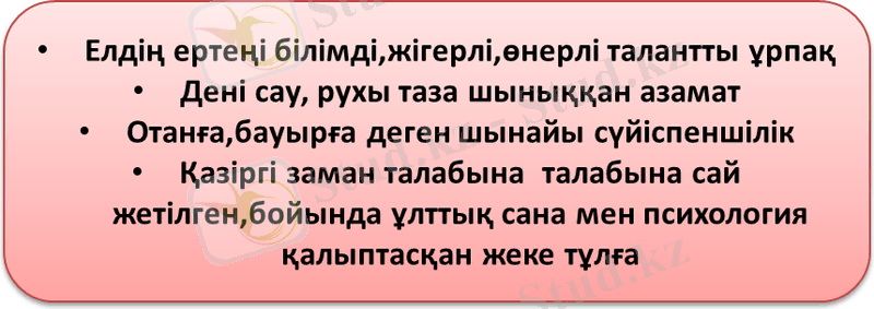 - Қазіргі заман талабына сай жетілген, бойында ұлттық сана мен психология қалыптасқан жеке тұлғаны дамыту