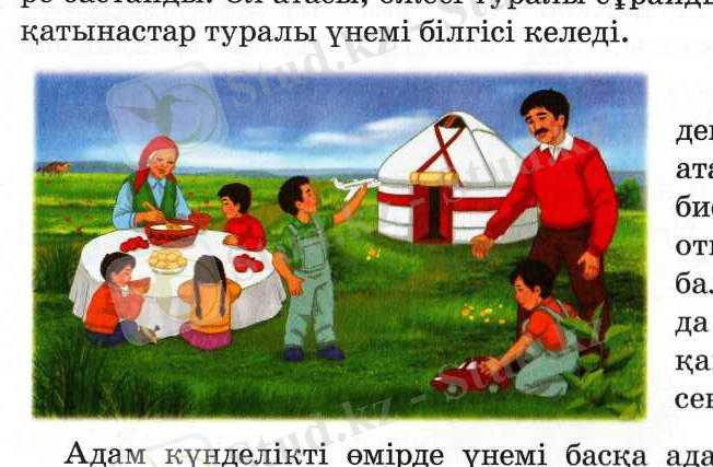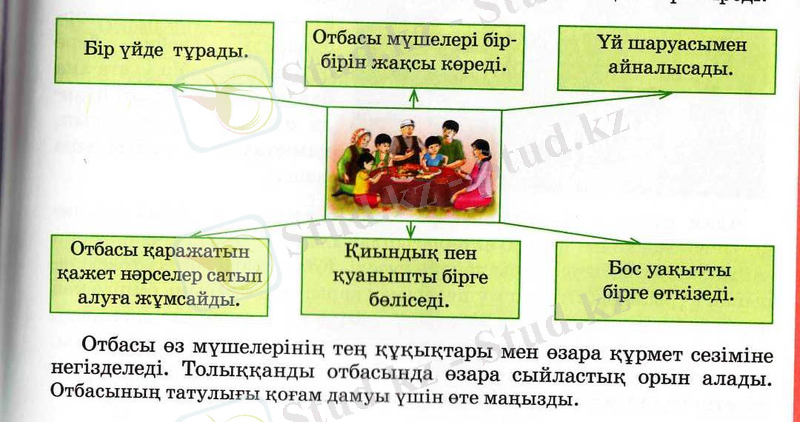 Отбасы-неке мен туыстық қатынастарға негізделген адамдар тобы. Отбасы дегеніміз-әкесі мен анасы, олардың балалары және ата-әжесі. Оларды бір-біріне деген махаббат, құрмет, бауырластық біріктіреді, олардың ортақ шаруашылығы, мүлкі болады. Отбасында балаларды ата-анасы өсіріп, тәрбиелейді. Оған аталар мен әжелер көмектеседі. Олар бала тәрбиелеу жөнінде кеңес береді, немерелерін күтіп-бағады. Ата-ана отбасын не қажеттің бәрімен қамтасыз етеді, сүйіспеншілікке және бірін-бірі құрметтеуге жағдай жасайды. Қазақ отбасында үлкенді сыйлау, құрметтеу және кішіге қамқорлық,