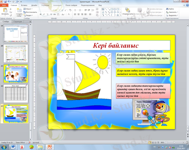 Оқушылар қайықтағы тудың түсін сабақты қалай түсінді, соған сәйкес бояйды.
