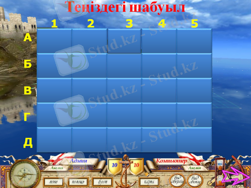 ІІ. «Теңіздегі шабуыл». Бұл кезеңде әр ұяшықты белгілейміз. Ұяшықты белгілеу арқылы біз кемеге түсуіміз керек. Сол кемеге түсу арқылы ондағы сұраққа жауап береді, сұраққа толық жауап берсе 2 ұпай, толық жауап бере алмаса 1 ұпай ала алады.