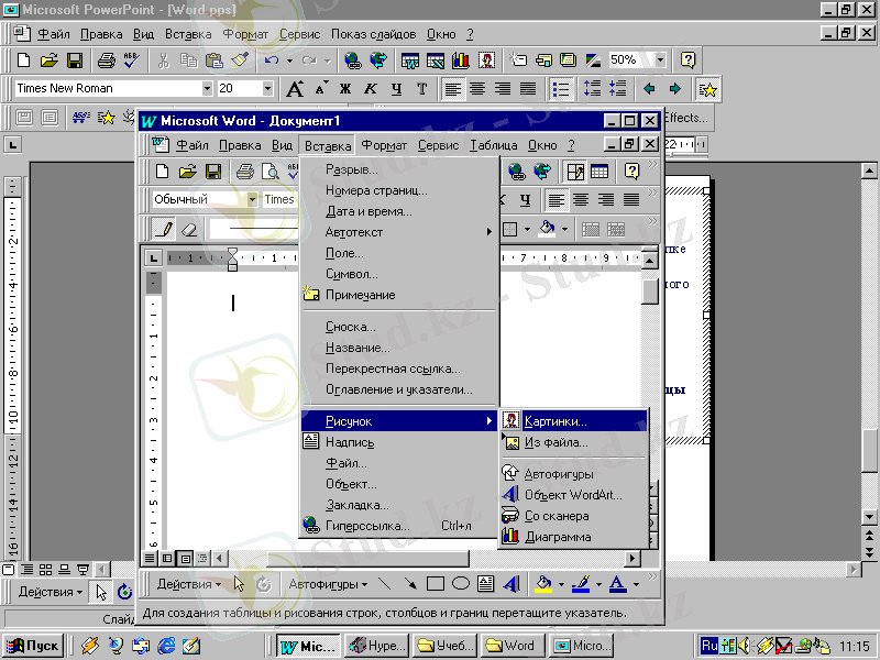 Үйге тапсырма: 1 мин. Құжатқа сурет кірістіру.