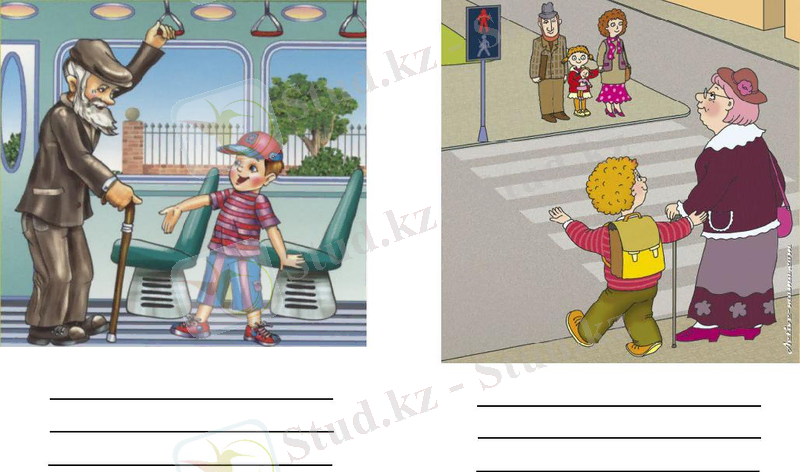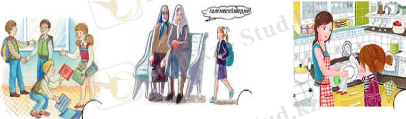 - Суреттерге мұқият қара. Қандай әдептілік ережелері бейнеленген? Жаз.