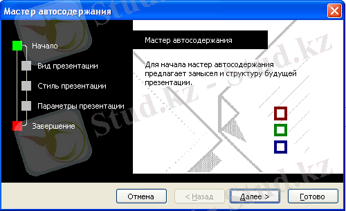 Автосодержание шебері көмегімен презентация жасау - бұл ең оңай, бірақ ең стандартталған әдісі. Бұл жағдайда шебер, Місгоsoft Оffiсе-тің көптеген шеберлері сияқты, белгілі бір сұрақтар қояды, сонымен қажет ақпаратты жинап және соның негізінде берілген тақырып бойынша слайдтар жиынын ұсынады. Алғаш пайдаланушы үшін бұл әдіс алғаш ең қарапайым және ыңғайлы көрінеді, себебі шебер оны презентация дайындаудың барлық. сатылары арқылы еткізеді. Басқа жағынан, ол дербес барлық маңызды шешімдерді қабылдайды, іс жүзінде тәуелсіз шығармашылык үшін мүмкіндікті қалдырмайды.