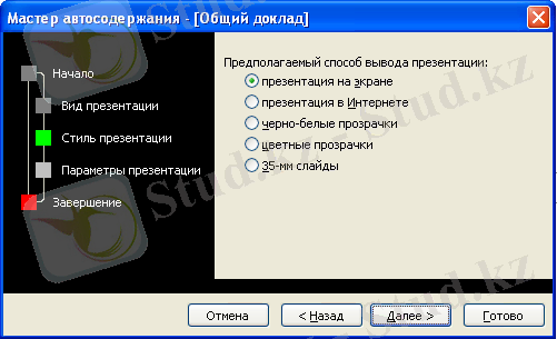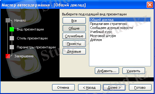 Қосу барыcында диалогты терезесі бар Роwег Роint терезесі шығады, ол түрлі әдіс пен презентацияны дайындауды ұсынады