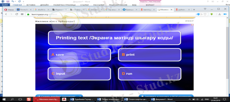 Өткен сабақты пысықтау: «Миллион кімге бұйырады?» Берілген сұрақтардың дұрыс жауабын таба отырып, өткен сабақ пысықталады.