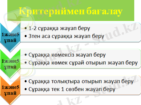 Тестті орындайды, тақтада көрсетілген ұпай арқылы, жауап парағына жинаған ұпайларын жазады.
