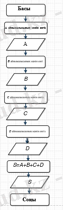 Бастапқы берілгендер: А, В, С, D айнымалылары. Олардың мәні программа орындалу барысында енгізіледі. Қосындысы S.