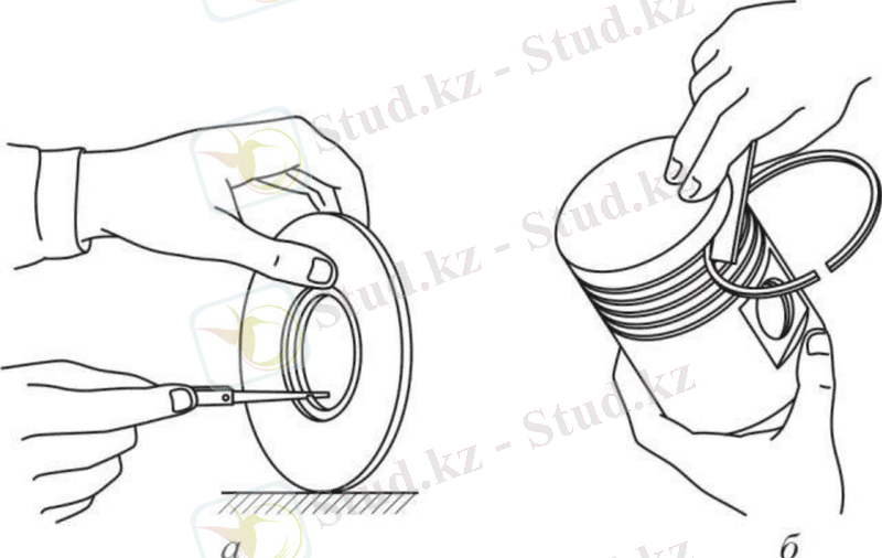 Сақинаны бақылау калибріне орнатқан кезде құлпындағы саңылауды өлшеу 8. 23, а-суретте көрсетілген. Сақина мен поршень кертігінің арасындағы саңылауды өлшеу 8. 23, б-суретте көрсетілген. Тиісті өлшемдегі поршеньді сақинаның саңылауы ұсақ кертікті егеудің көмегімен үйлестіріле алады.